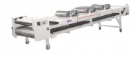 不銹鋼帶冷卻壓片機(jī)由壓輥、不銹鋼鏈板、破碎輥和行走機(jī)構(gòu)組成。擠出機(jī)擠出的熱熔狀態(tài)物料經(jīng)壓輥壓成1-1.5mm厚的帶狀物。壓輥采用水冷卻。物料在輸送過程中用吹風(fēng)機(jī)吹風(fēng),繼續(xù)將物料冷卻成固態(tài),破碎成片狀物料落入料斗。